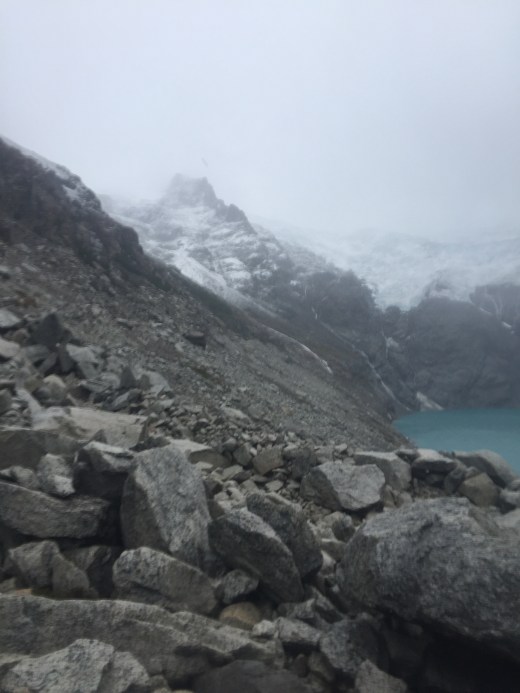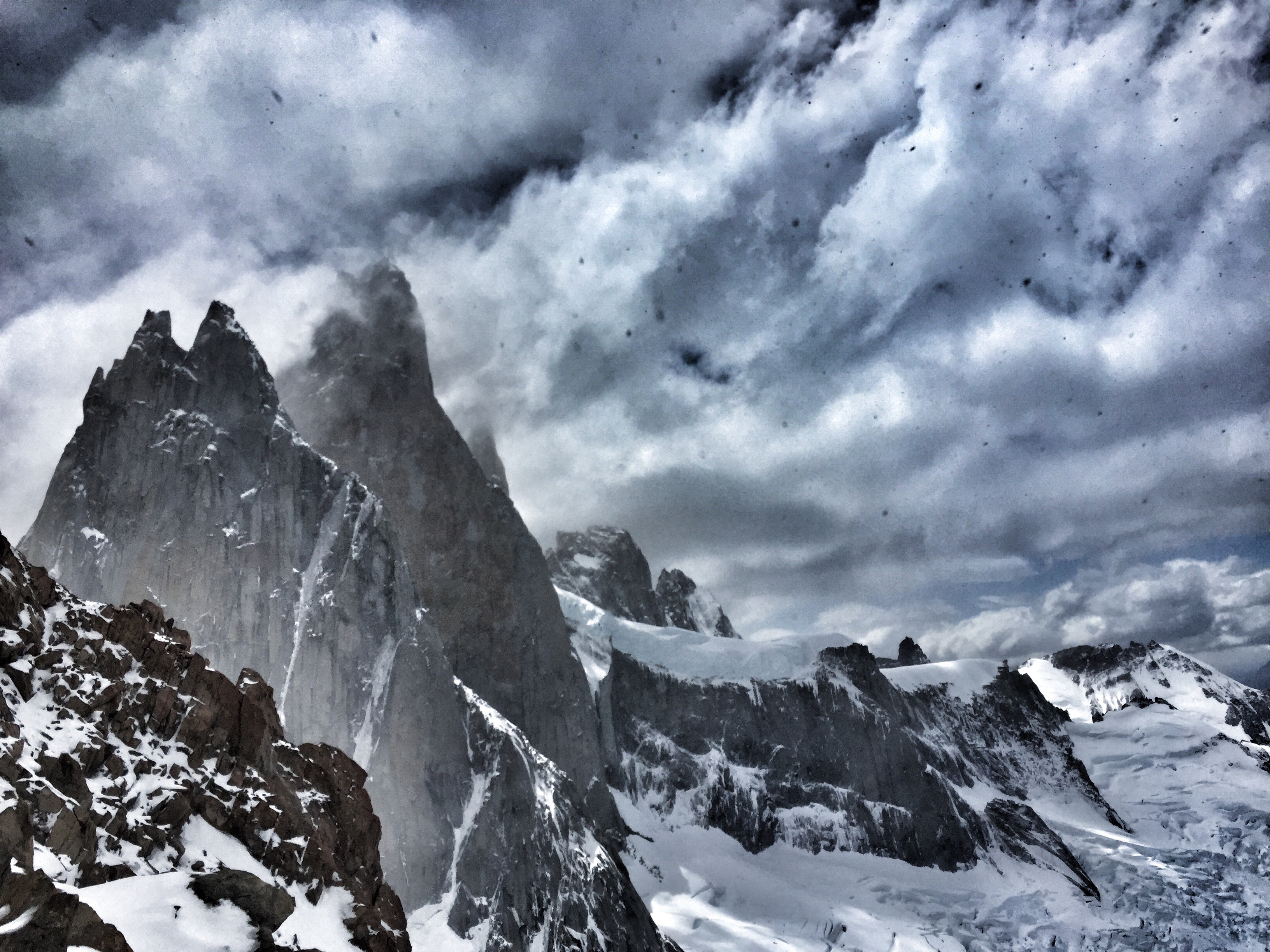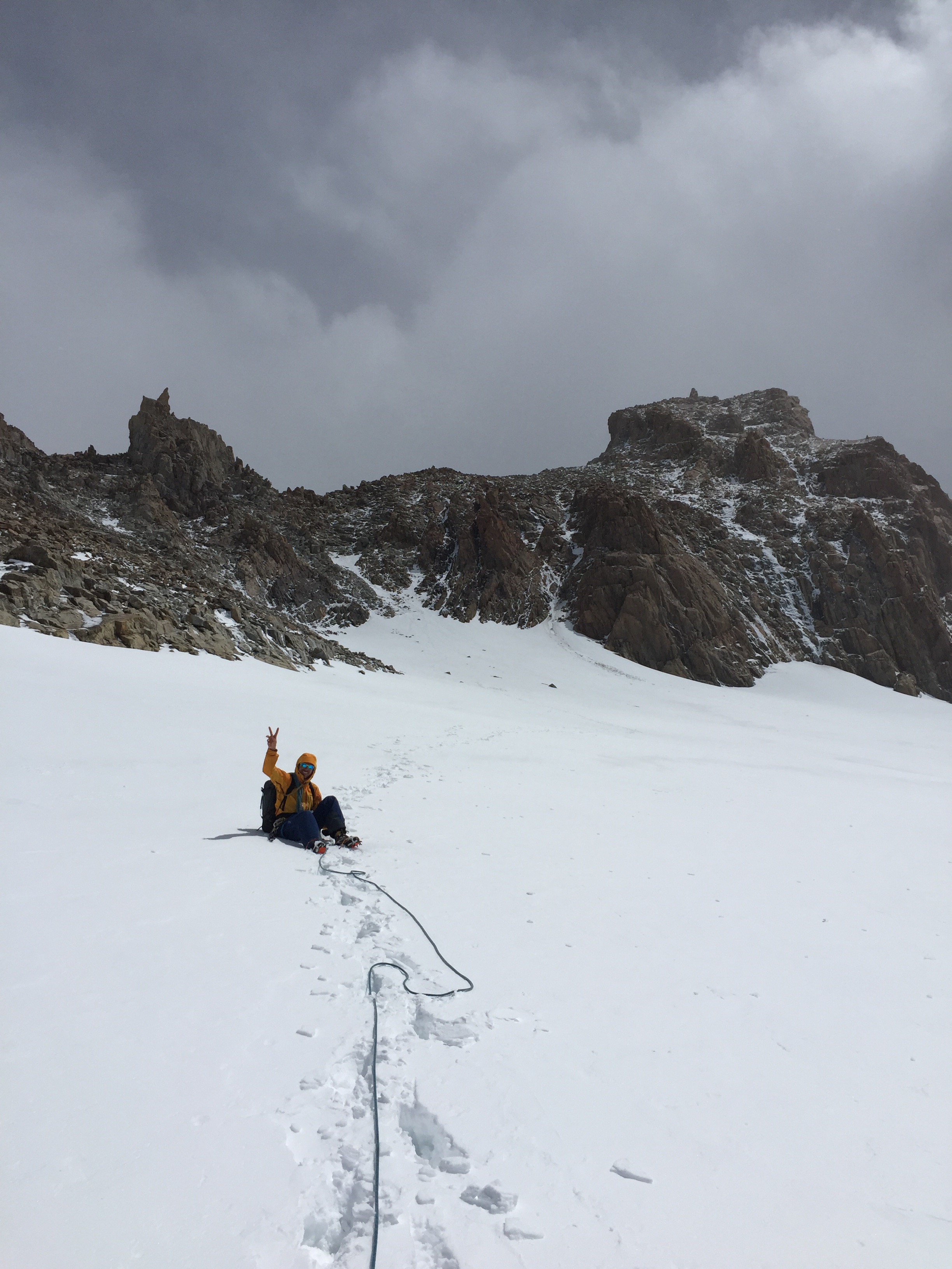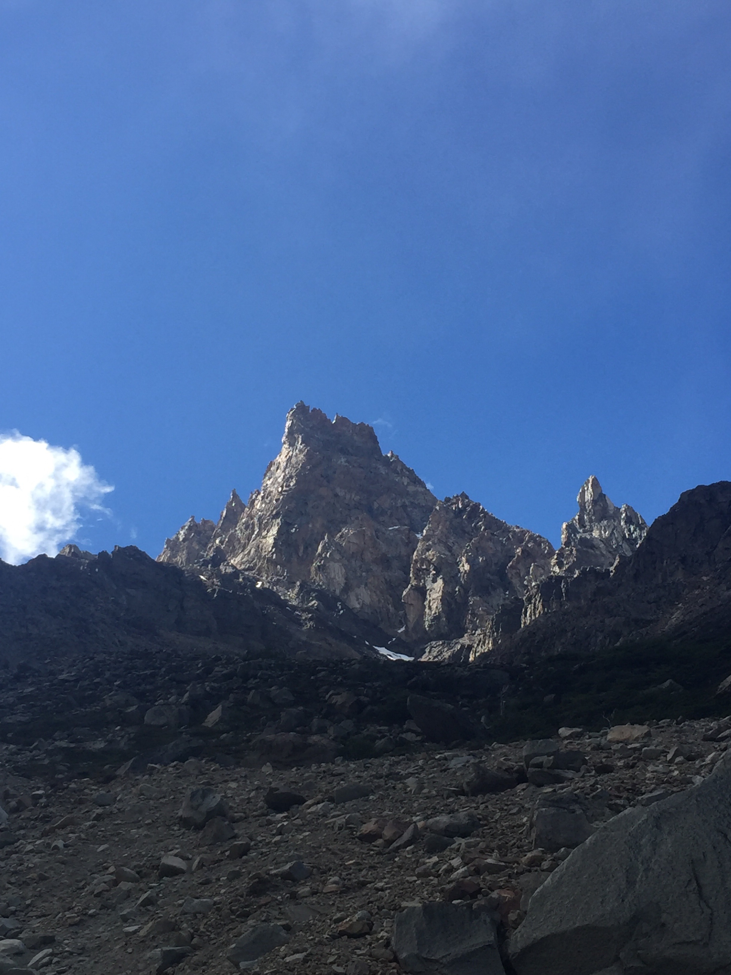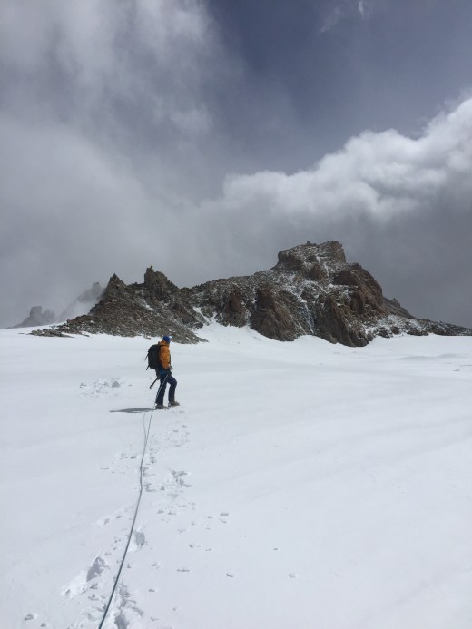 La deuxième fenêtre météo s’est présentée et nous sommes remontés avec tout notre matos dans l’espoir de faire une ces belles aiguilles. Malheureusement la fenêtre s’est transformée en hublot, et nous avons même eu du mal à gravir notre plan C, le Mojon Rojo (2250m), un sommet très facile par beau temps, qui là, nous a fait douter toute la journée mais qui à la fin, nous a apporté joie et contentement. A quatre pattes sur l’arête pour lutter contre le vent, nous avons fini par arriver au sommet et de là nous avons pu admirer les aiguilles de l’S, de Saint Exupéry, de Poincenot, … une vue inoubliable…