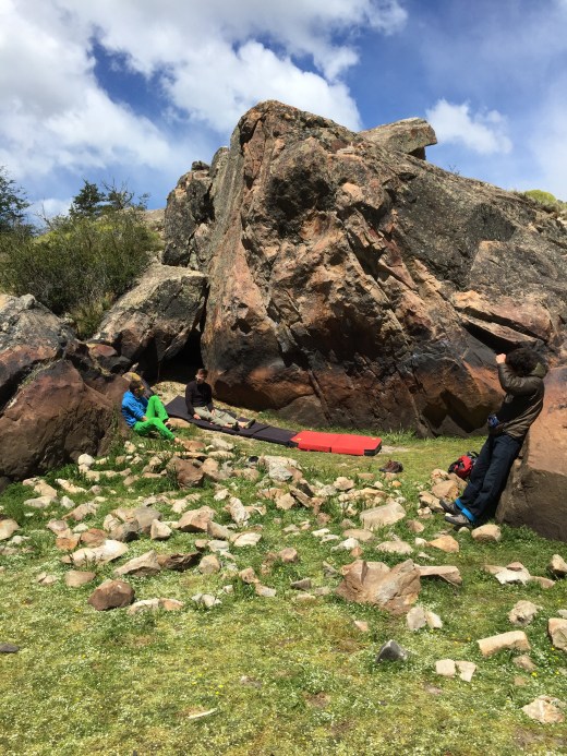Le retour à El Chalten fut rapide et ensuite ce fut l’attente pour la prochaine fenêtre météo ! Lire, marcher , « stretcher », faire un peu de bloc, et envoyer quelques nouvelles à la famille, tout ça en regardant le topo 200 fois par jour pour trouver des idées, des voies, des plans A, B, C, D, E…